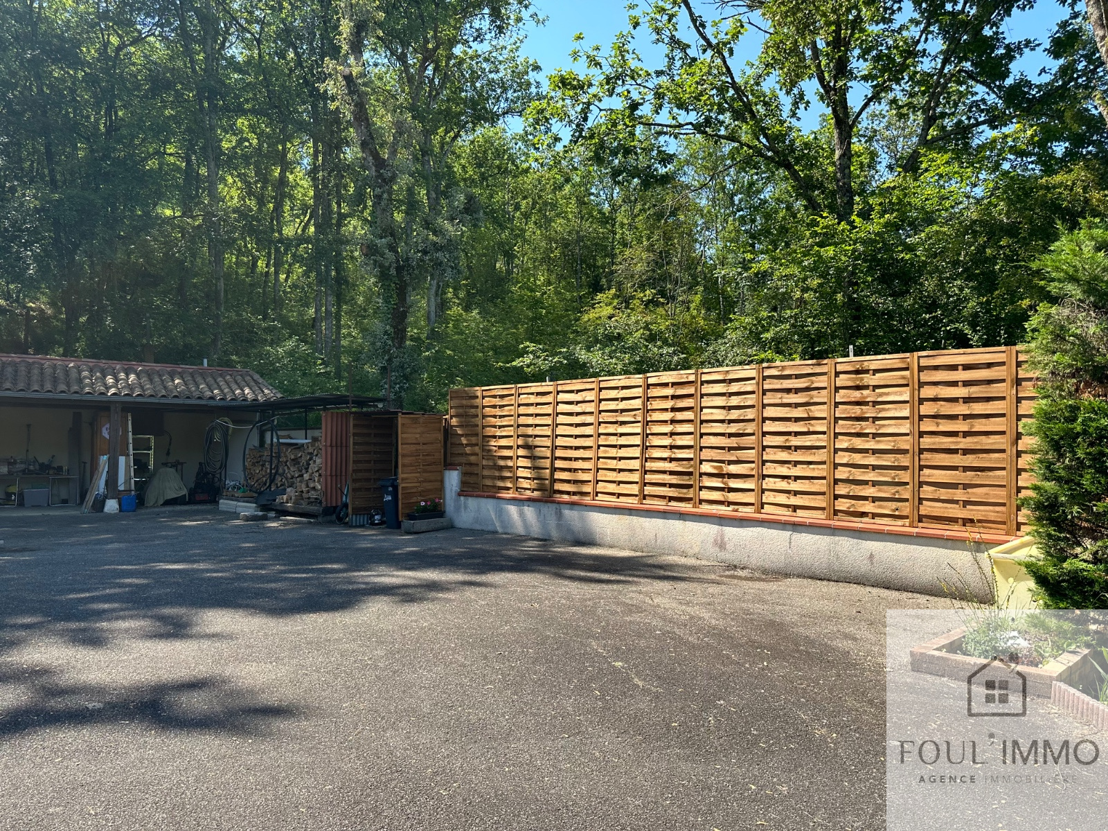 L'extérieur dispose d'une terrasse couverte donnant une vue dégagée sur les environs et sur la piscine.
